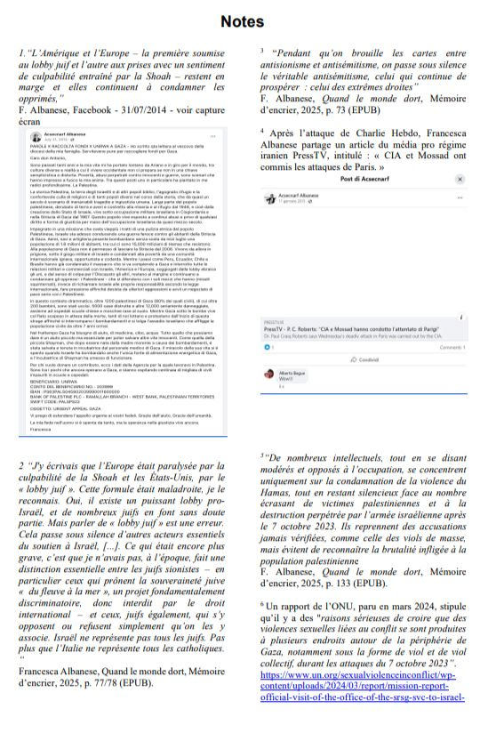 En 2014, Francesca Albanese écrivait que l’Amérique était « soumise au lobby juif ». Dans son livre, elle qualifie ces propos de simple « maladresse ». Elle affirme ensuite être victime d’une « instrumentalisation de l’antisémitisme », invoque ses « amis israéliens » comme caution, disant qu’ils constituent son « armure », et soutient que seule l’extrême droite serait réellement antisémite. Comme si reconnaître la persistance et la gravité de l’antisémitisme d’extrême droite dispensait de voir qu’il peut aussi exister, sous d’autres formes, dans certains espaces se réclamant de la gauche ou des mouvements d’émancipation.