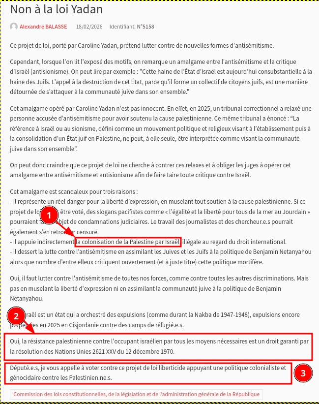 3) Enfin la dernière phrase nous paraît relever encore une fois, non d’une critique, mais d’une criminalisation de cette loi : « Député.e.s, je vous appelle à voter contre ce projet de loi liberticide appuyant une politique colonialiste et génocidaire contre les Palestinien.ne.s. »